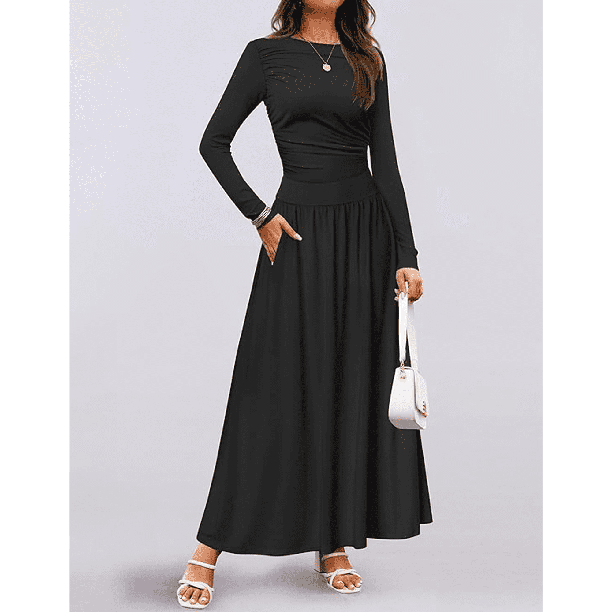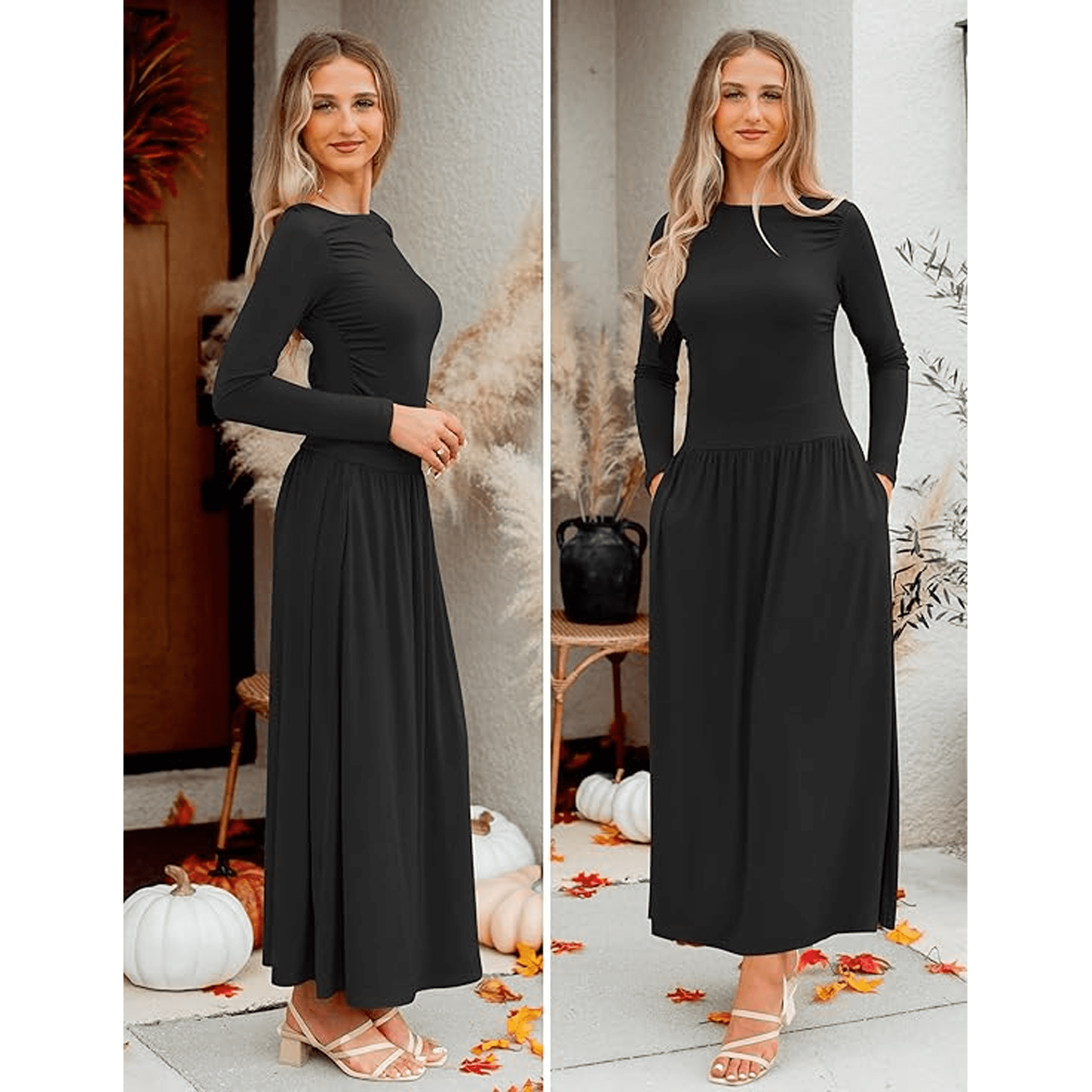 - Elegant Black Maxi Dress for Women:This black long sleeve dress features a classic round neck and flowing silhouette, making it a timeless choice among womens dresses, black dresses for women, and long sleeve maxi dress for women styles.